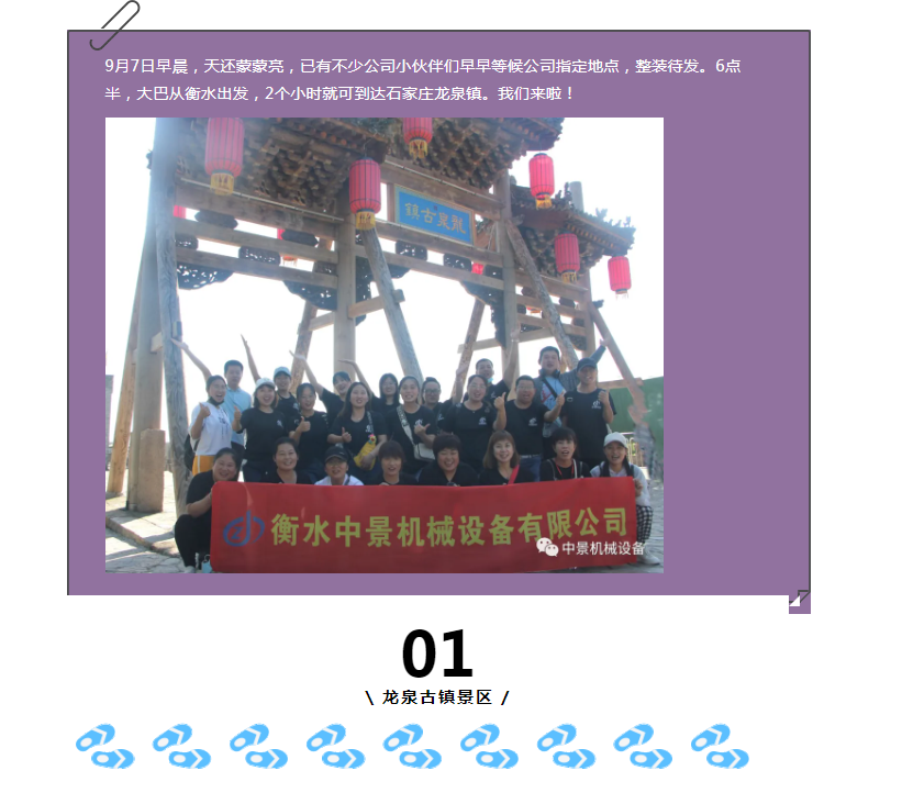 至此,中景機械公司2021年第七次旅游記石家莊龍泉古鎮(zhèn)團建活動圓滿結束。通過此次旅游團建,不僅體現(xiàn)了公司對員工的關懷,讓家人們在放松身心、陶冶情操之余,增進了團隊凝聚力和團隊合作精神,以更加飽滿的熱情投入到工作中,攜手共創(chuàng)美好未來!繼續(xù)快樂生活!開心工作!